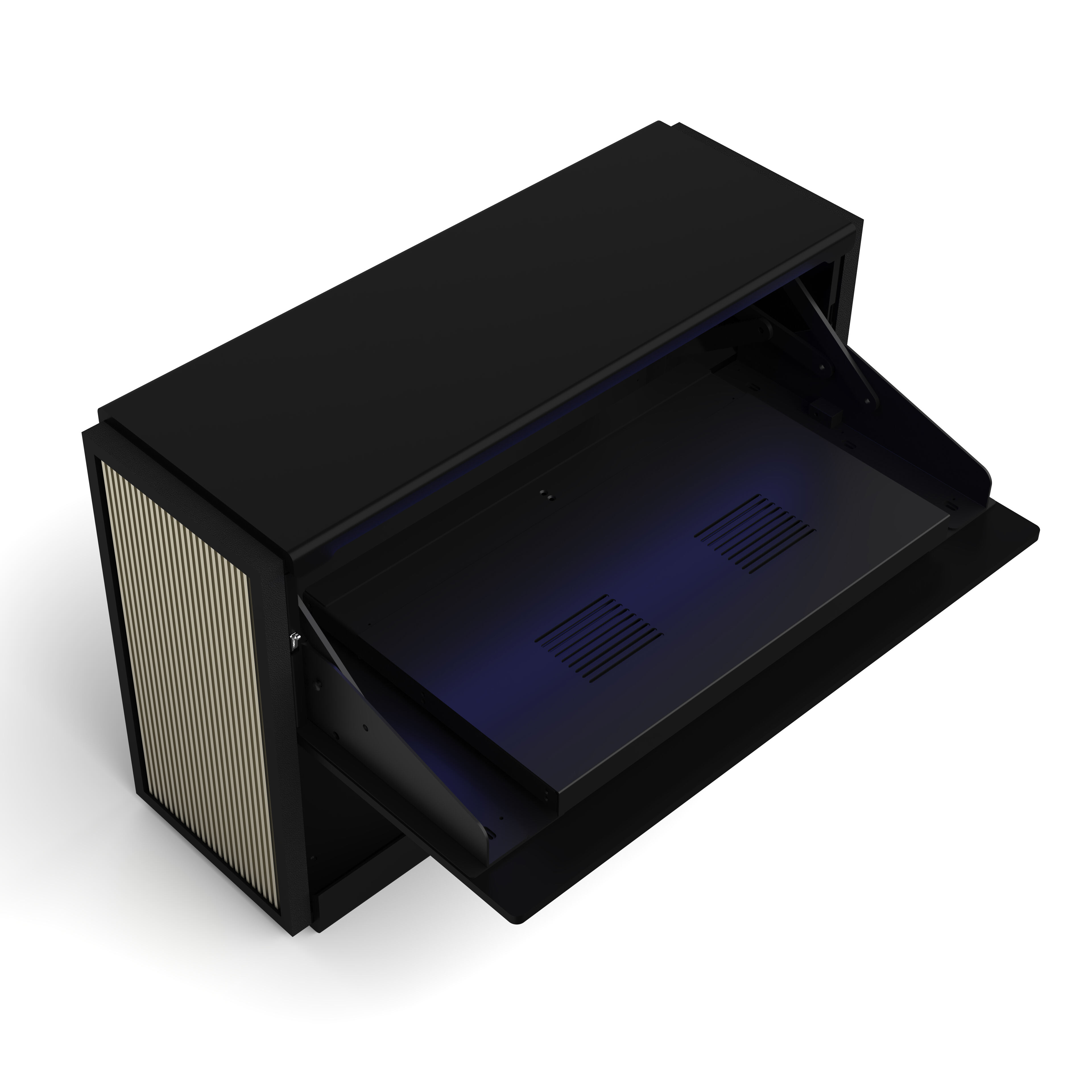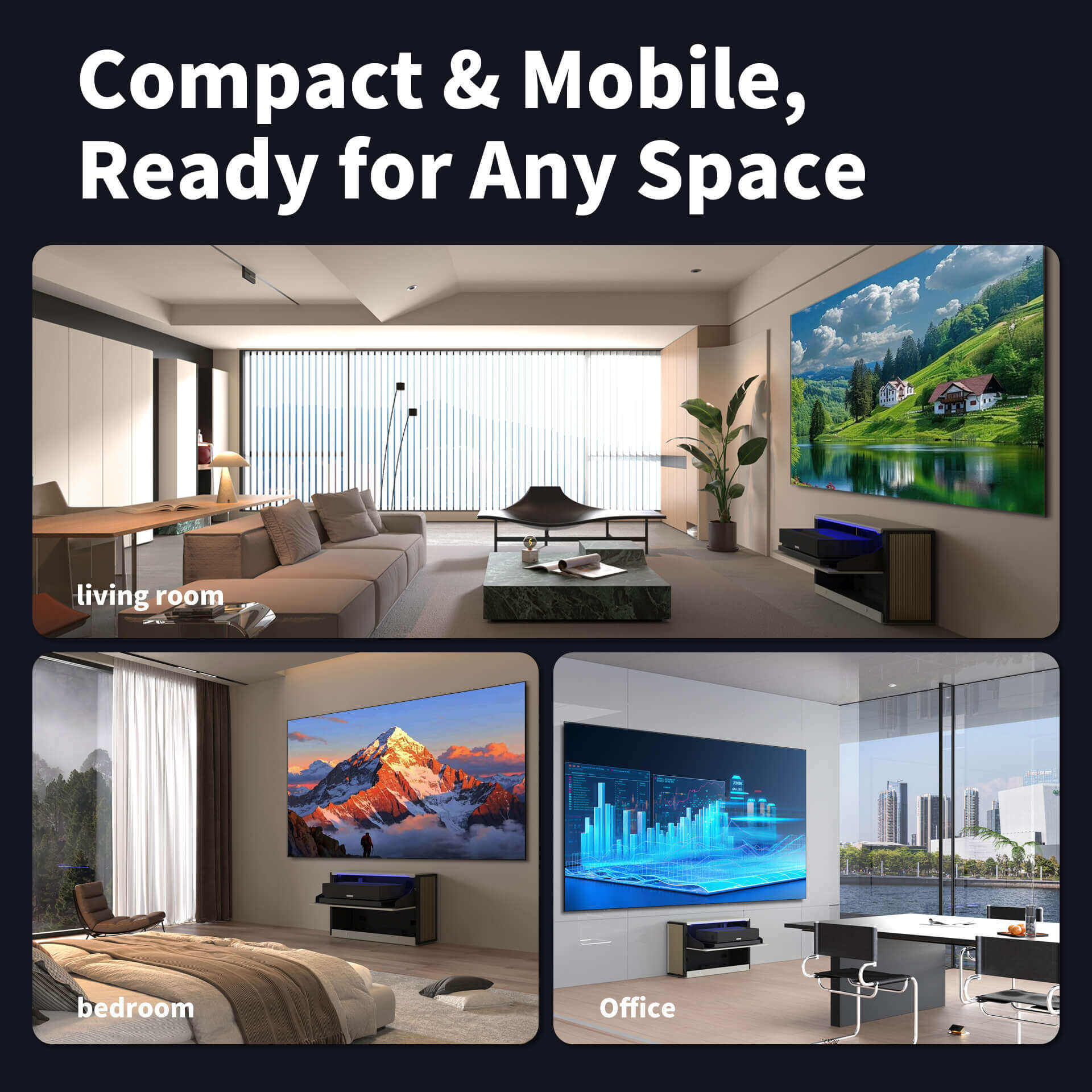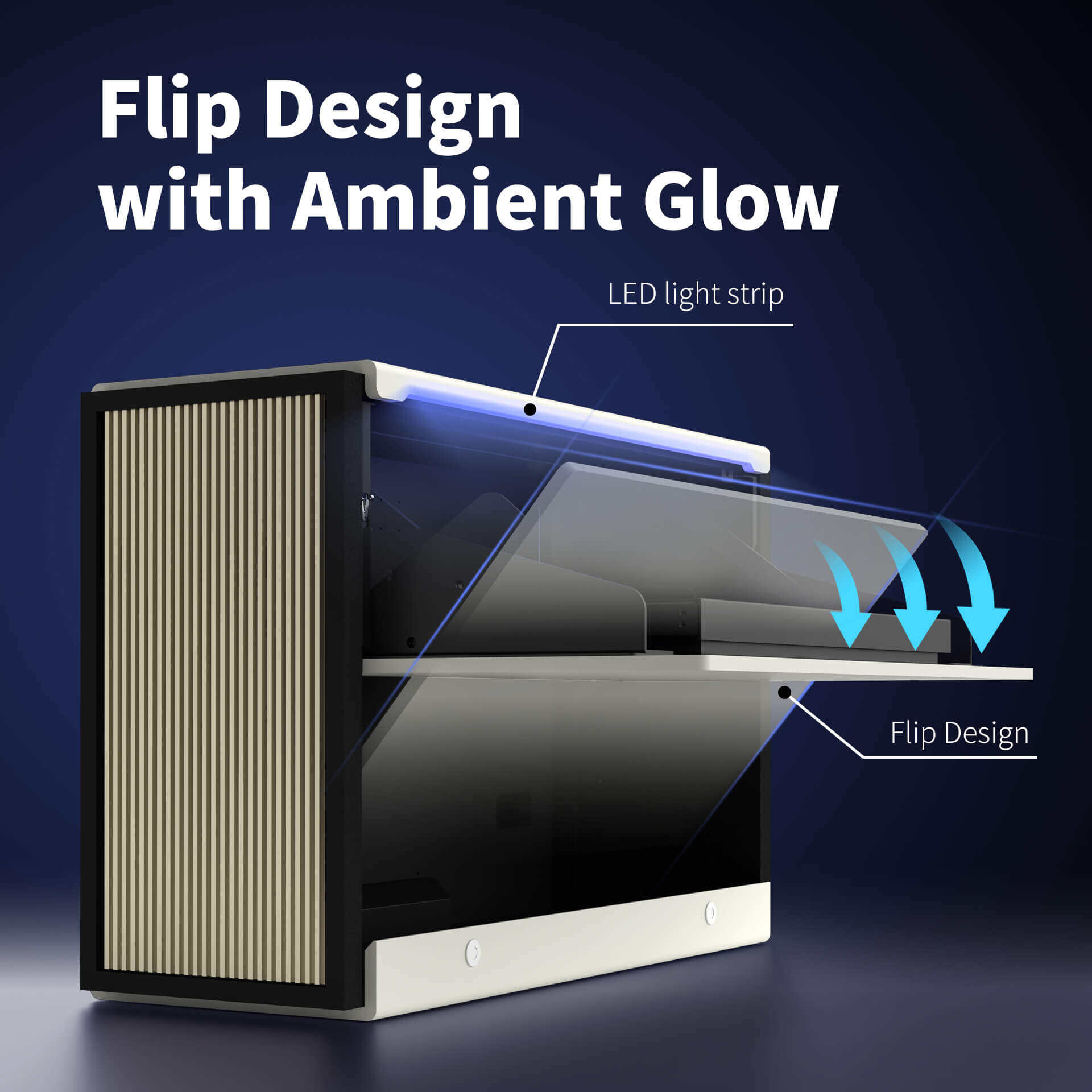 Diseño abatible con luz ambiental – Abra hacia arriba para revelar una tira de luces LED integrada que crea instantáneamente un ambiente cinematográfico.